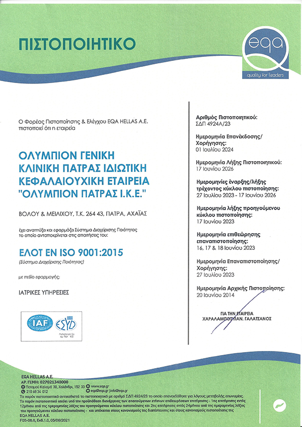 Η ΟΛΥΜΠΙΟΝ Γενική Κλινική Πάτρας αρχικώς ανέπτυξε και εφαρμόζει ένα Σύστημα Διαχείρισης Ποιότητας σύμφωνα με τις απαιτήσεις του διεθνούς προτύπου EN ISO 9001:2015. Η πιστοποίηση αυτή αφορά σε όλο το εύρος των δραστηριοτήτων της ΟΛΥΜΠΙΟΝ Γενική Κλινική Πάτρας και αποδεικνύει τόσο την ικανότητά μας να παρέχουμε με συνέπεια ποιοτικές και ασφαλείς υπηρεσίες υγείας, που ικανοποιούν τις απαιτήσεις των ασθενών μας όσο και την δέσμευσή μας για συνεχή βελτίωση των υπηρεσιών αυτών. Το Σύστημα Διαχείρισης Ποιότητας της ΟΛΥΜΠΙΟΝ Γενική Κλινική Πάτρας είναι πιστοποιημένο από το 2014 κατά το πρότυπο ΕΝ ISO 9001:2015 από τον έγκριτο και διεθνώς αναγνωρισμένο φορέα πιστοποίησης EQA HELLAS.