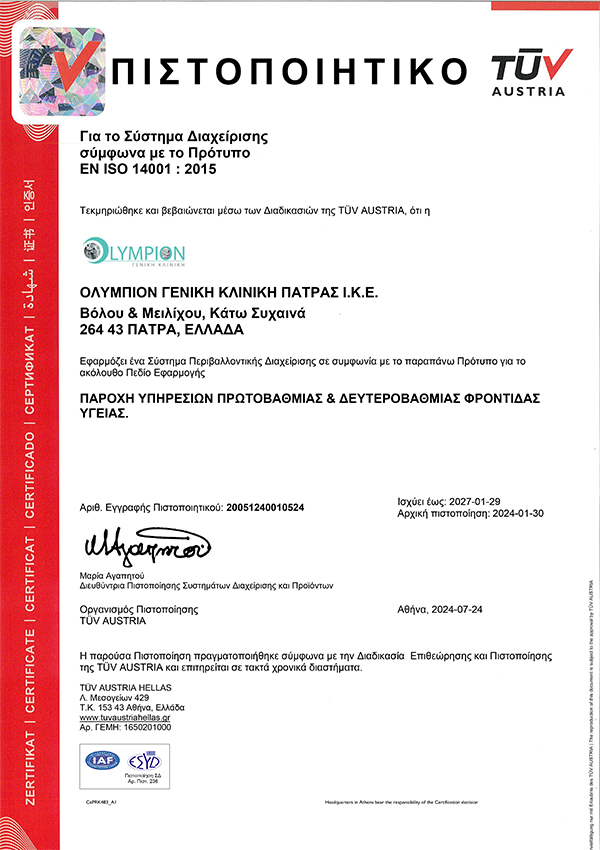 Η ΟΛΥΜΠΙΟΝ Γενική Κλινική Πάτρας έχει αναπτύξει και εφαρμόζει ένα Σύστημα Περιβαλλοντικής Διαχείρισης Ποιότητας σύμφωνα με τις απαιτήσεις του διεθνούς προτύπου EN ISO 14001:2015. Η πιστοποίηση αυτή αφορά σε όλο το εύρος των δραστηριοτήτων της ΟΛΥΜΠΙΟΝ Γενική Κλινική Πάτρας και αποδεικνύει την ευαισθησία και την υπευθυνότητά μας μας στον τομέα της περιβαλλοντικής προστασίας. Με την πιστοποίηση αυτή δεσμευόμαστε για την πρόληψη της ρύπανσης, την εξοικονόμηση των φυσικών πόρων, τη διαχείριση των αποβλήτων και την συμμόρφωσή μας με τις αντίστοιχες νομοθετικές απαιτήσεις. Το Σύστημα Περιβαλλοντικής Διαχείρισης Ποιότητας της ΟΛΥΜΠΙΟΝ Γενική Κλινική Πάτρας είναι πιστοποιημένο από το 2024 κατά το πρότυπο ΕΝ ISO 14001:2015 από τον έγκριτο και διεθνώς αναγνωρισμένο φορέα πιστοποίησης TÜV AUSTRIA HELLAS.