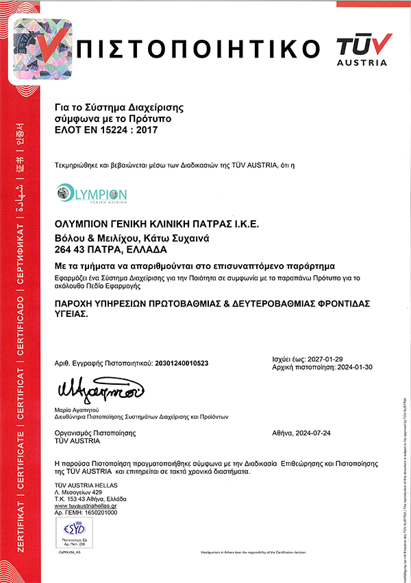 Το Σύστημα Διαχείρισης Ποιότητας που εφαρμόζει η ΟΛΥΜΠΙΟΝ Γενική Κλινική Πάτρας είναι σύμφωνο και με τις απαιτήσεις του διεθνούς προτύπου EN ISO 15224:2017. Η πιστοποίηση αυτή αφορά σε όλο το εύρος της παρεχόμενης Πρωτοβάθμιας και Δευτεροβάθμιας Φροντίδας Υγείας, από το σύνολο των Τμημάτων, Εργαστηρίων και Μονάδων της Κλινικής καθώς και στις υποστηρικτικές υπηρεσίες. Η ΟΛΥΜΠΙΟΝ Γενική Κλινική Πάτρας μέσω αυτής της πιστοποίησης καλύπτει πλήρως τις απαιτήσεις του προτύπου που αφορούν στην προσβασιμότητα και ασφάλεια των ασθενών, στην κατάλληλη και έγκαιρη φροντίδα βασισμένη σε τεκμήρια, γνώσεις και βέλτιστες διεθνείς πρακτικές, καθώς και στη διαχείριση της κλινικής διακινδύνευσης. Το Σύστημα Διαχείρισης Ποιότητας της ΟΛΥΜΠΙΟΝ Γενική Κλινική Πάτρας είναι πιστοποιημένο από το 2024 κατά το πρότυπο ΕΝ ISO 15224:2017 από τον έγκριτο και διεθνώς αναγνωρισμένο φορέα πιστοποίησης TÜV AUSTRIA HELLAS.